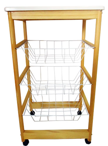 Fruteira de madeira 3 cestos com rodízios e bancada